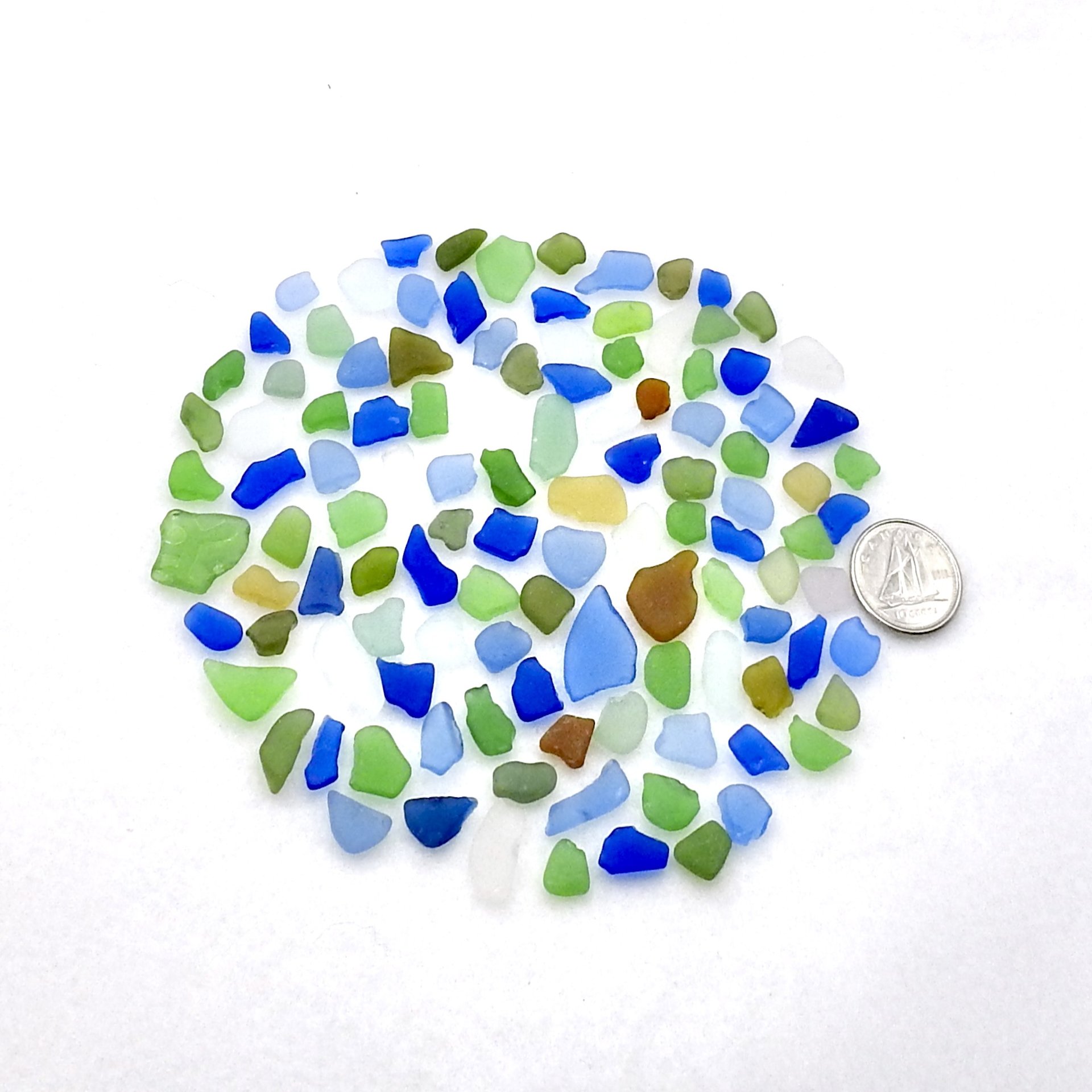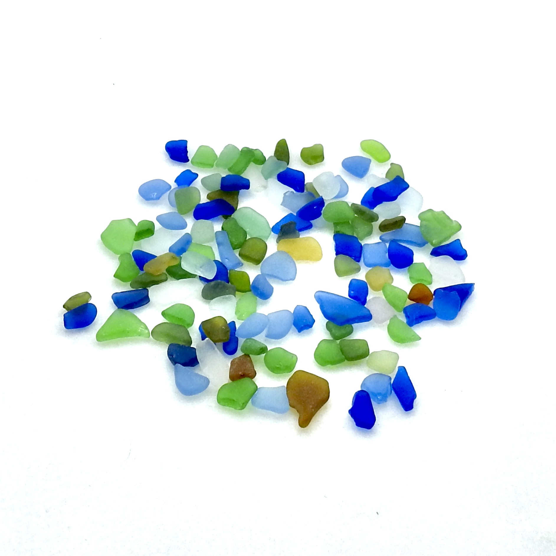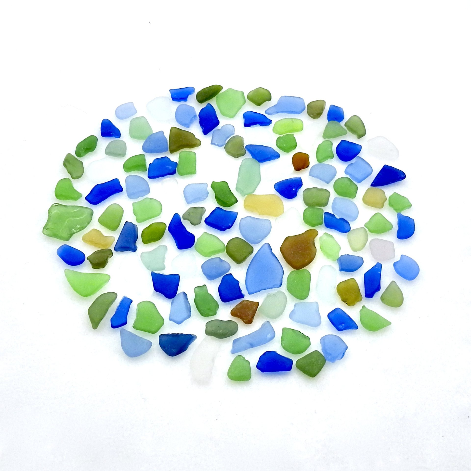 Genuine sea glass, over 100 tiny flat craft quality pieces for mosaics, trivets, frames, artwork or other beached themed projects. All of these pieces have shiny spots, edges or nicks.