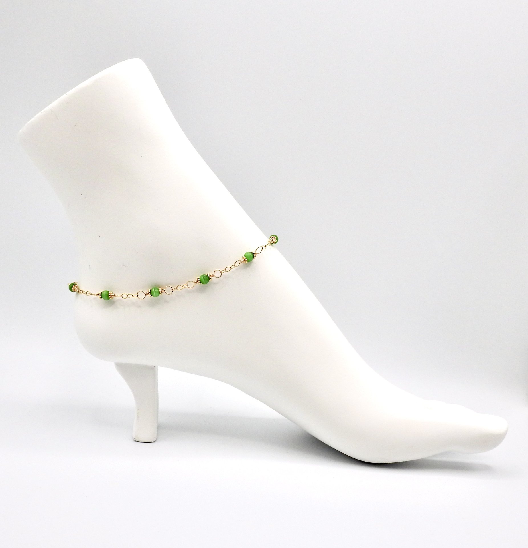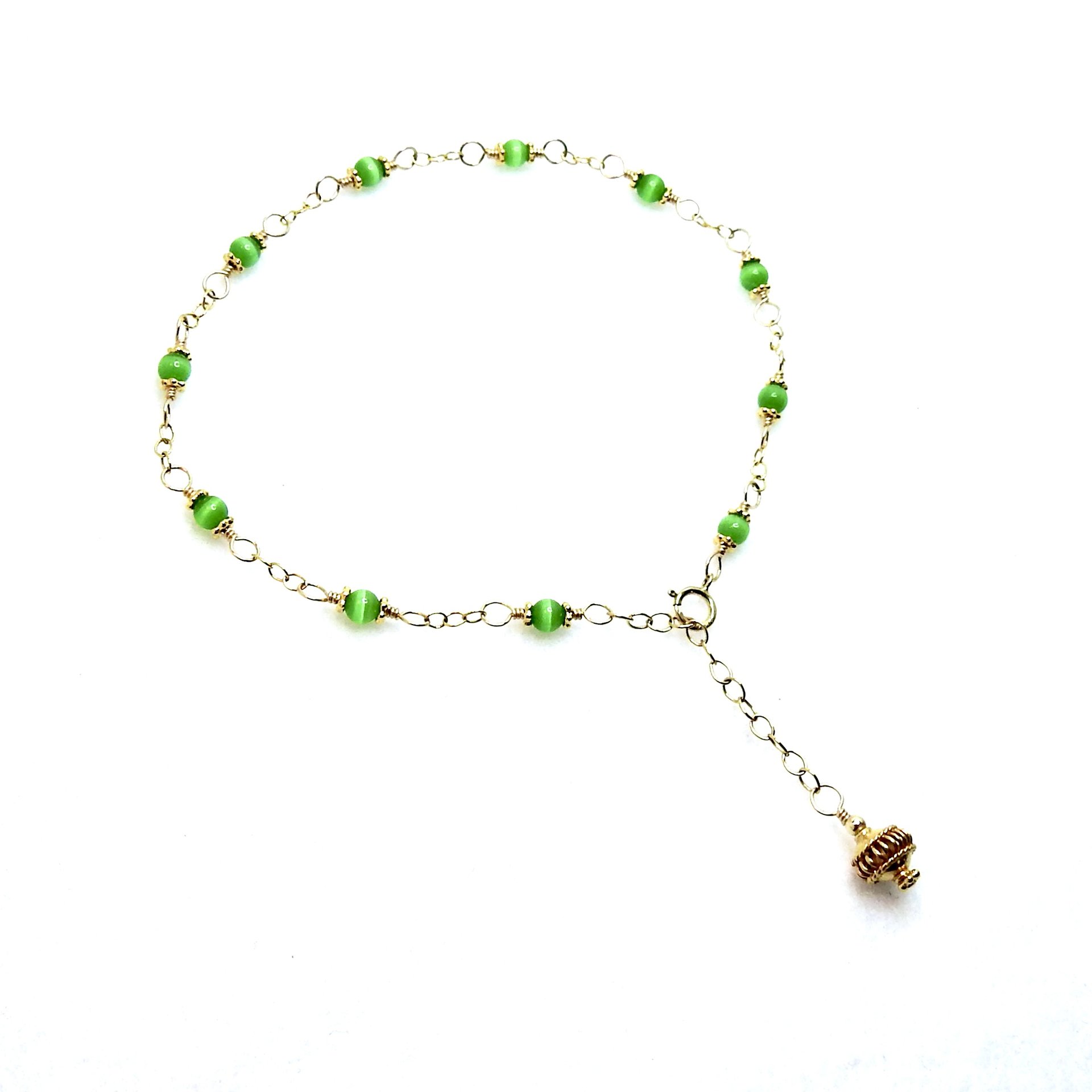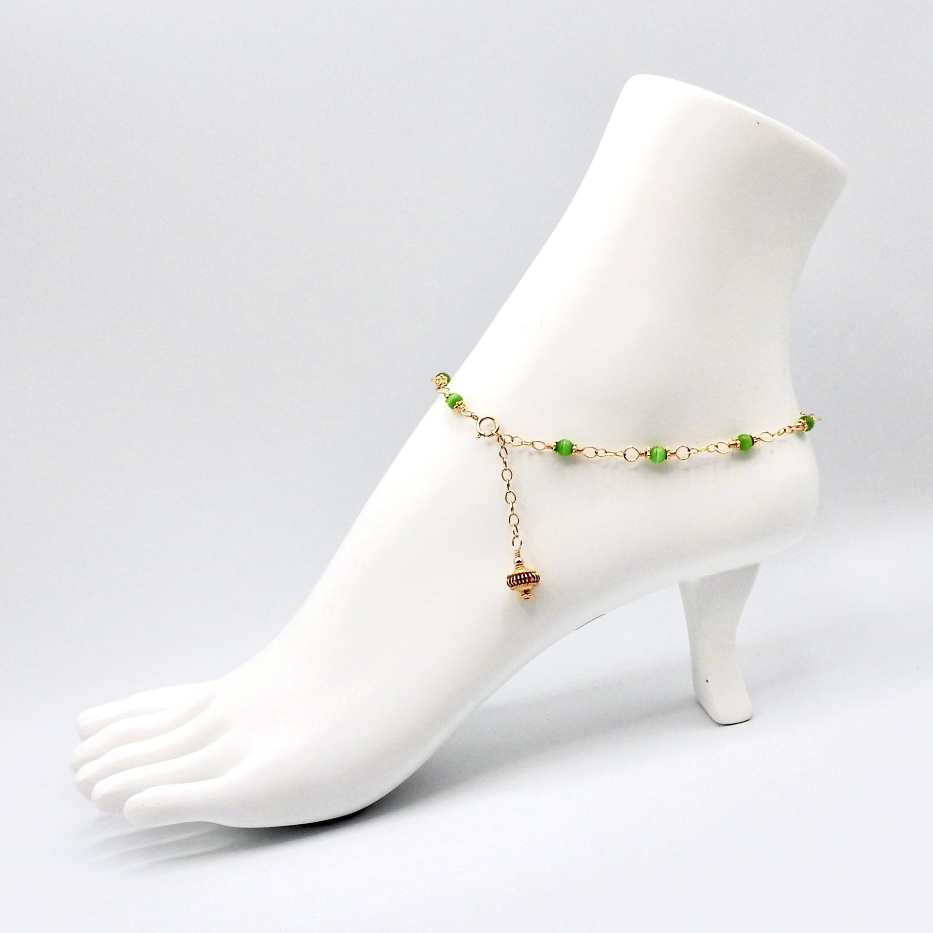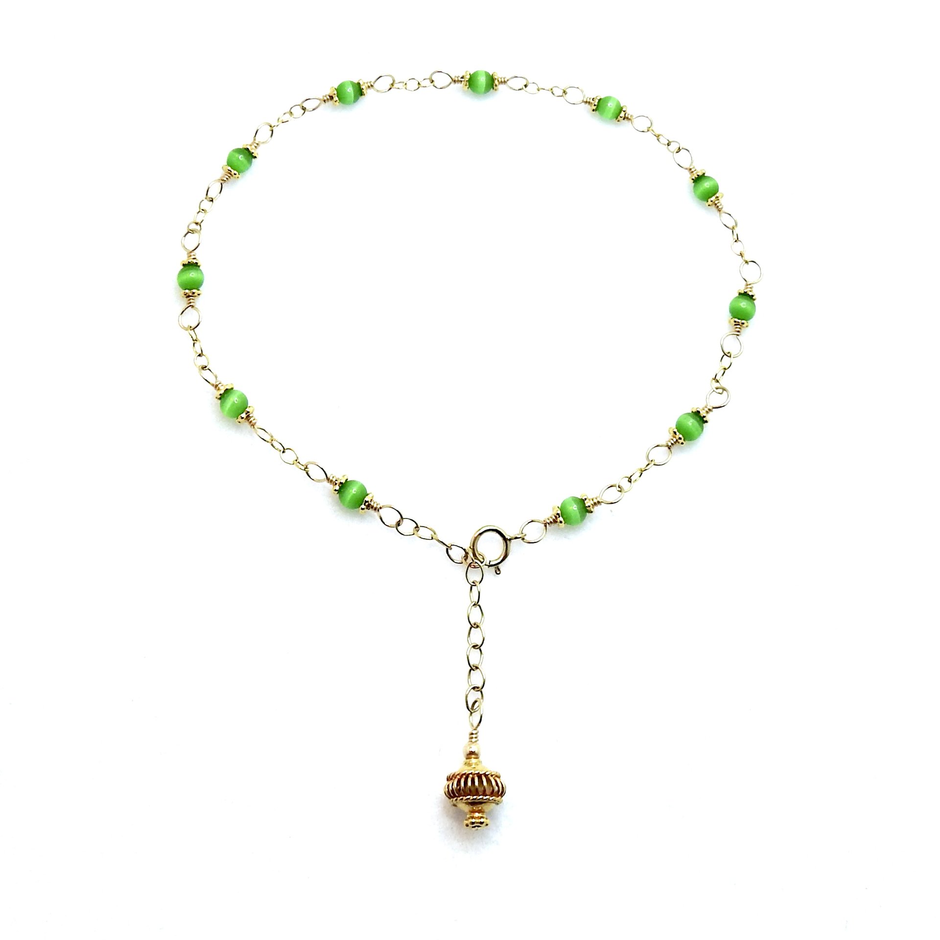 A bright green anklet for women, handmade with tiny cat's eye beads and an adjustable vermeil gold Bali bead dangle.