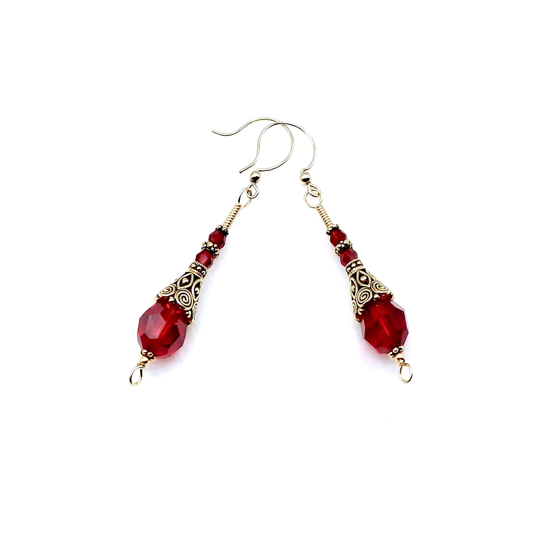 Long red crystal earrings, handmade with dark siam Swarovski Elements, decorative gold cones and caps.
