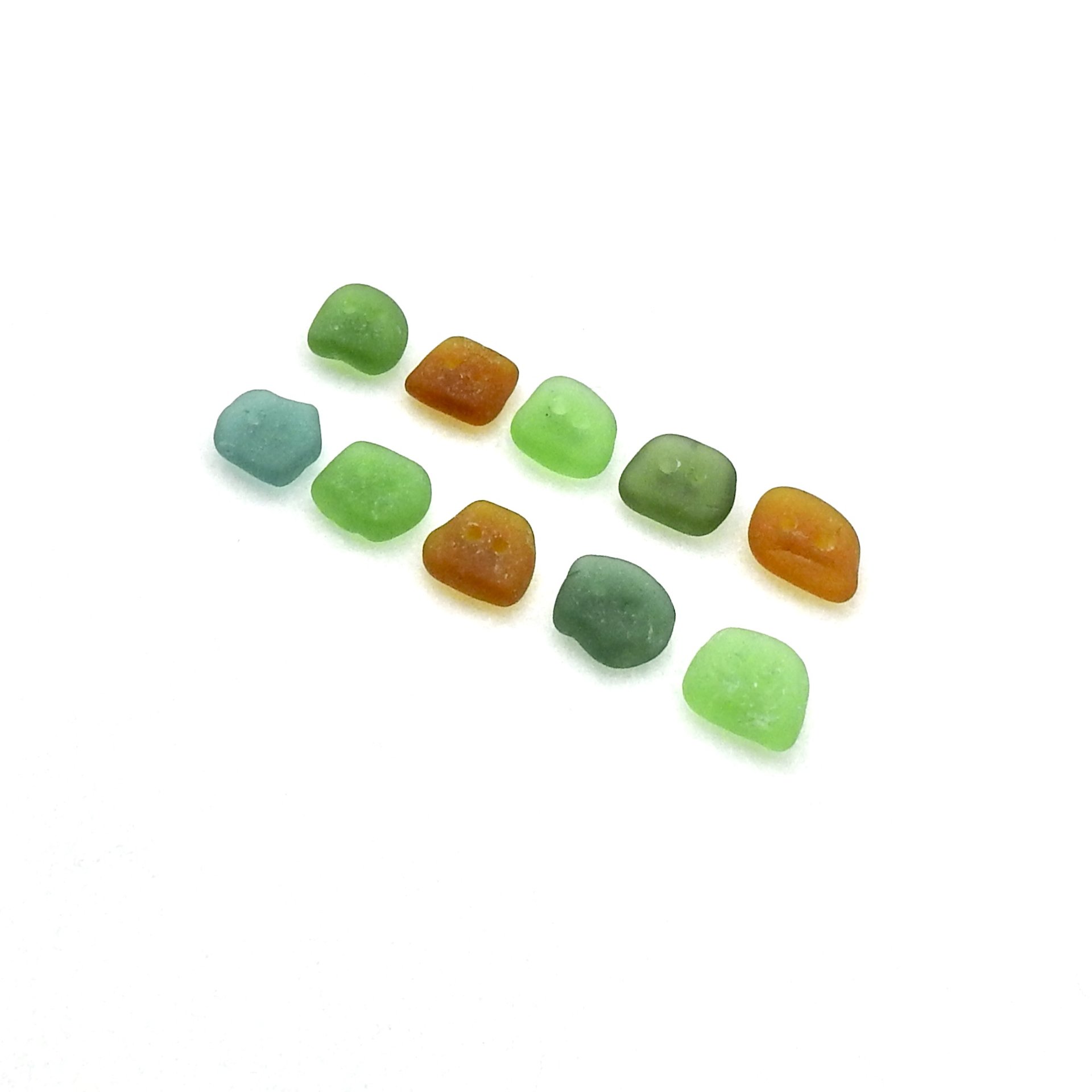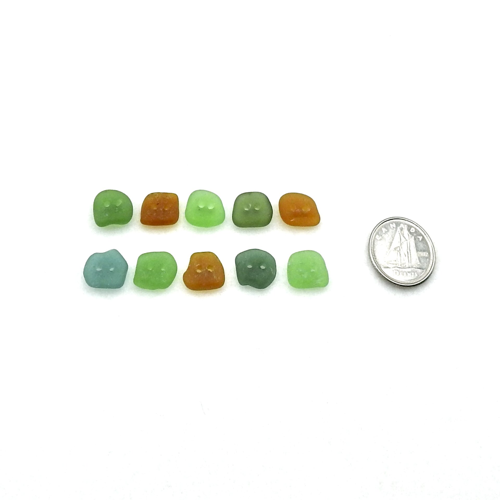 Genuine sea glass buttons, set of 10, in shades of green and brown with two drilled holes for sewing, decoration or other beach themed crafts.