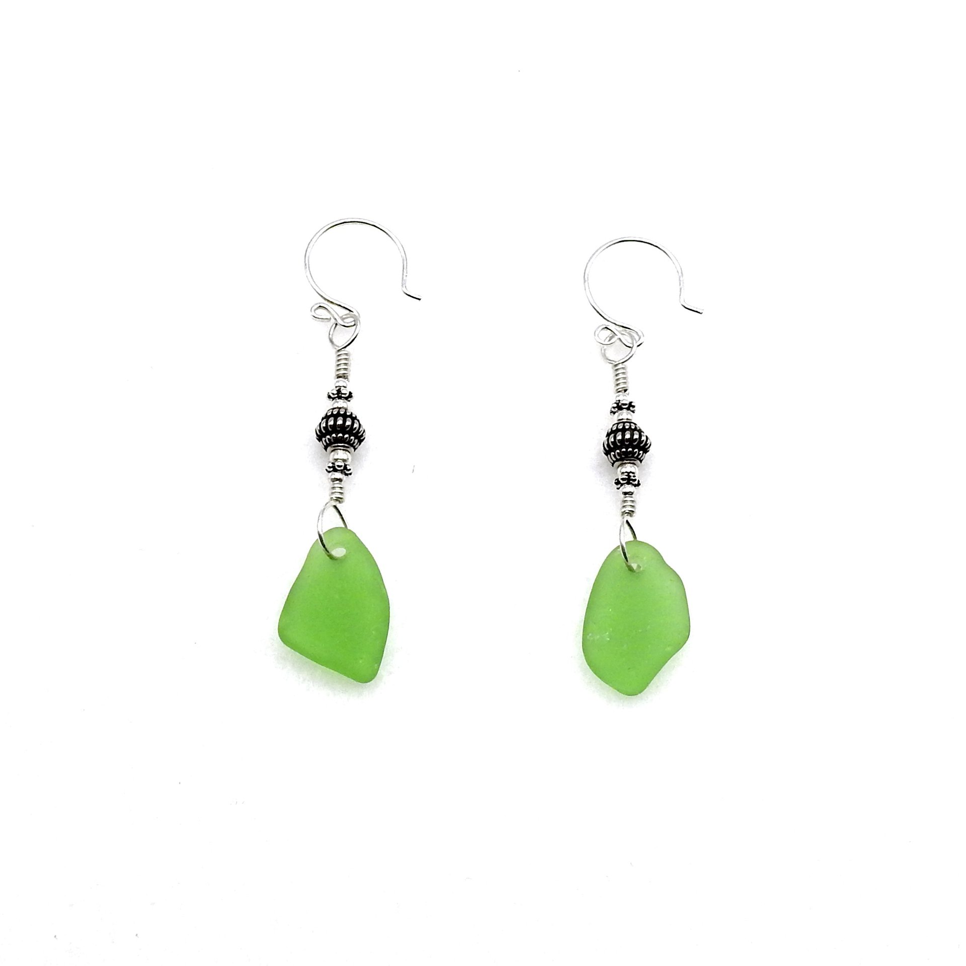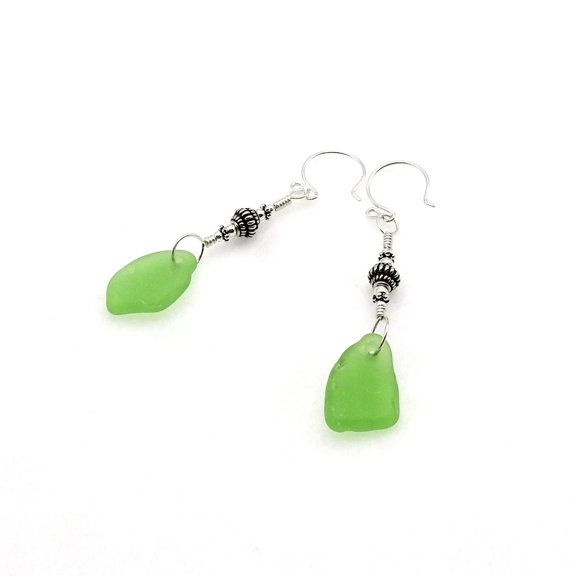 Dangle earrings, handcrafted with green genuine sea glass charms accented with sterling silver Bali beads.