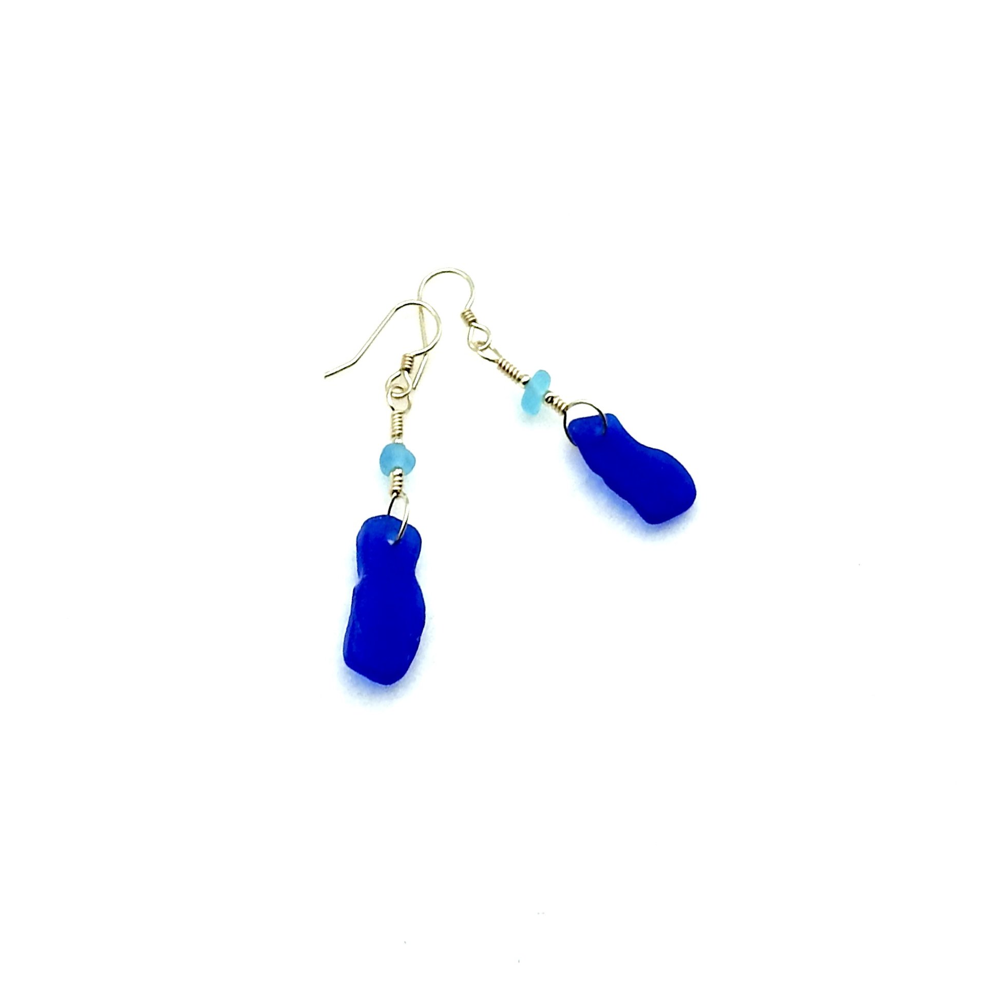Gold dangle earrings, handmade with genuine sea glass in the colours of cobalt blue with aqua blue accents.