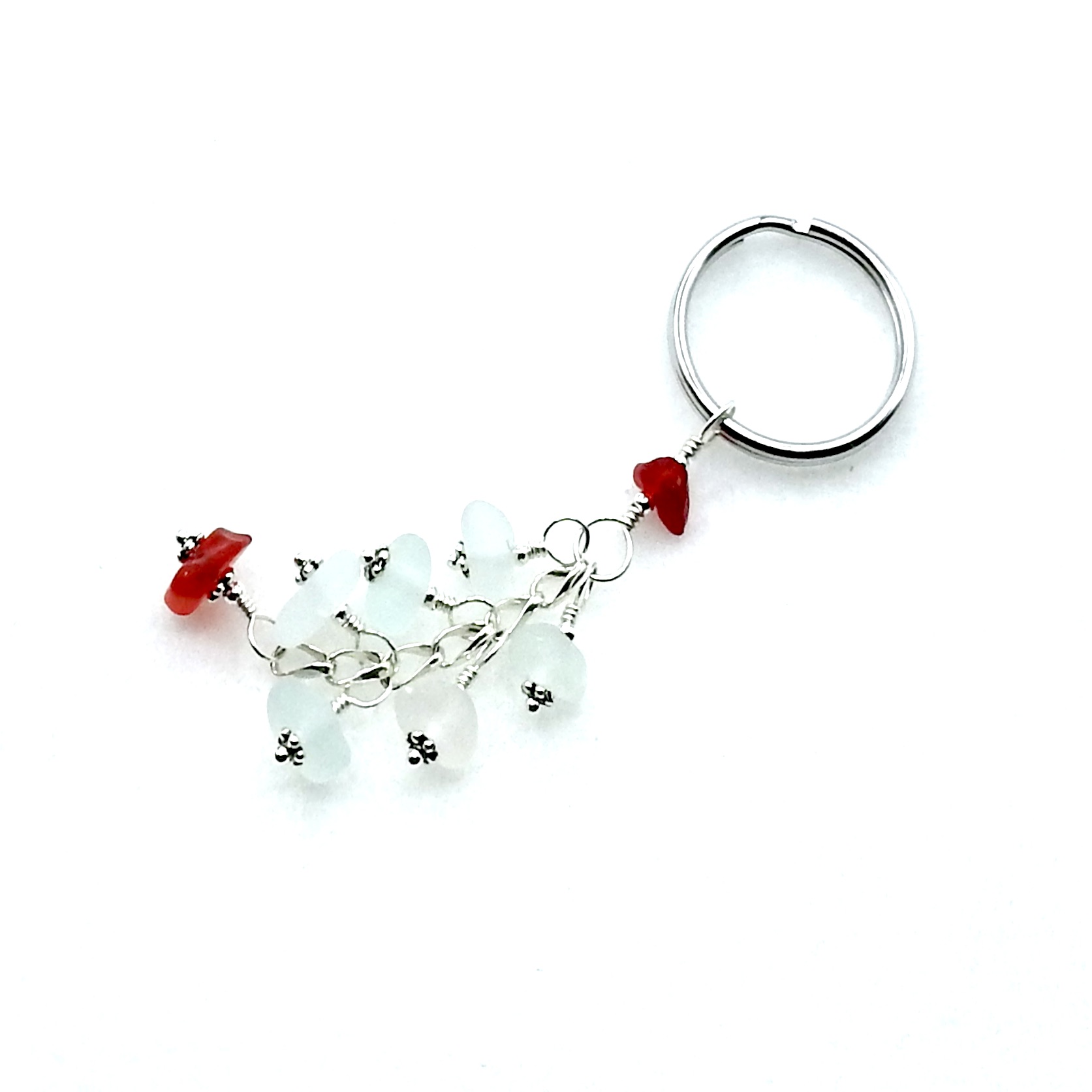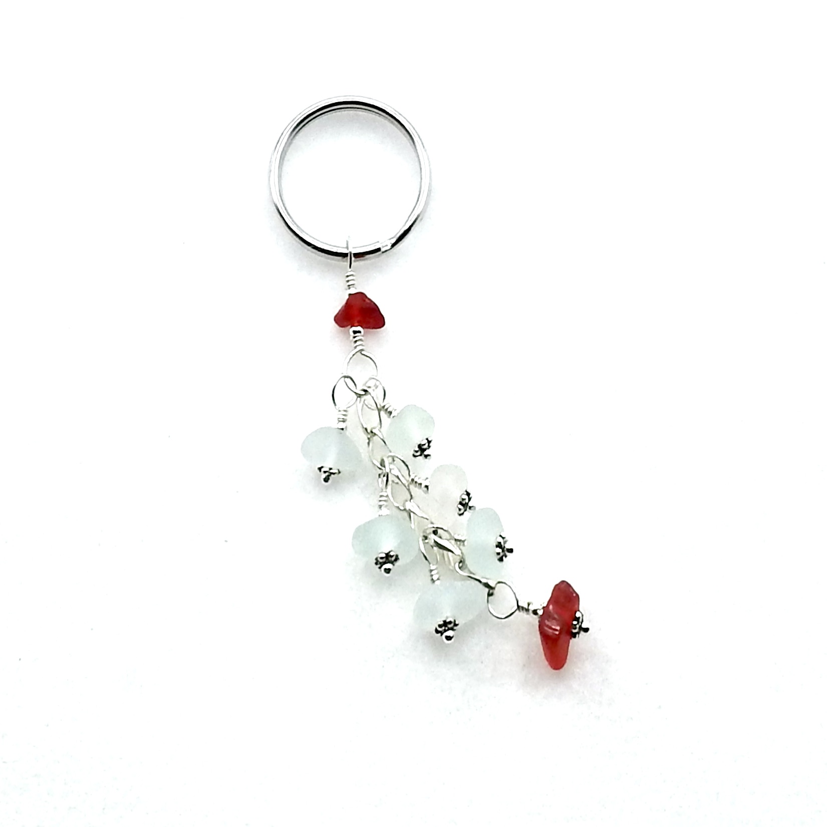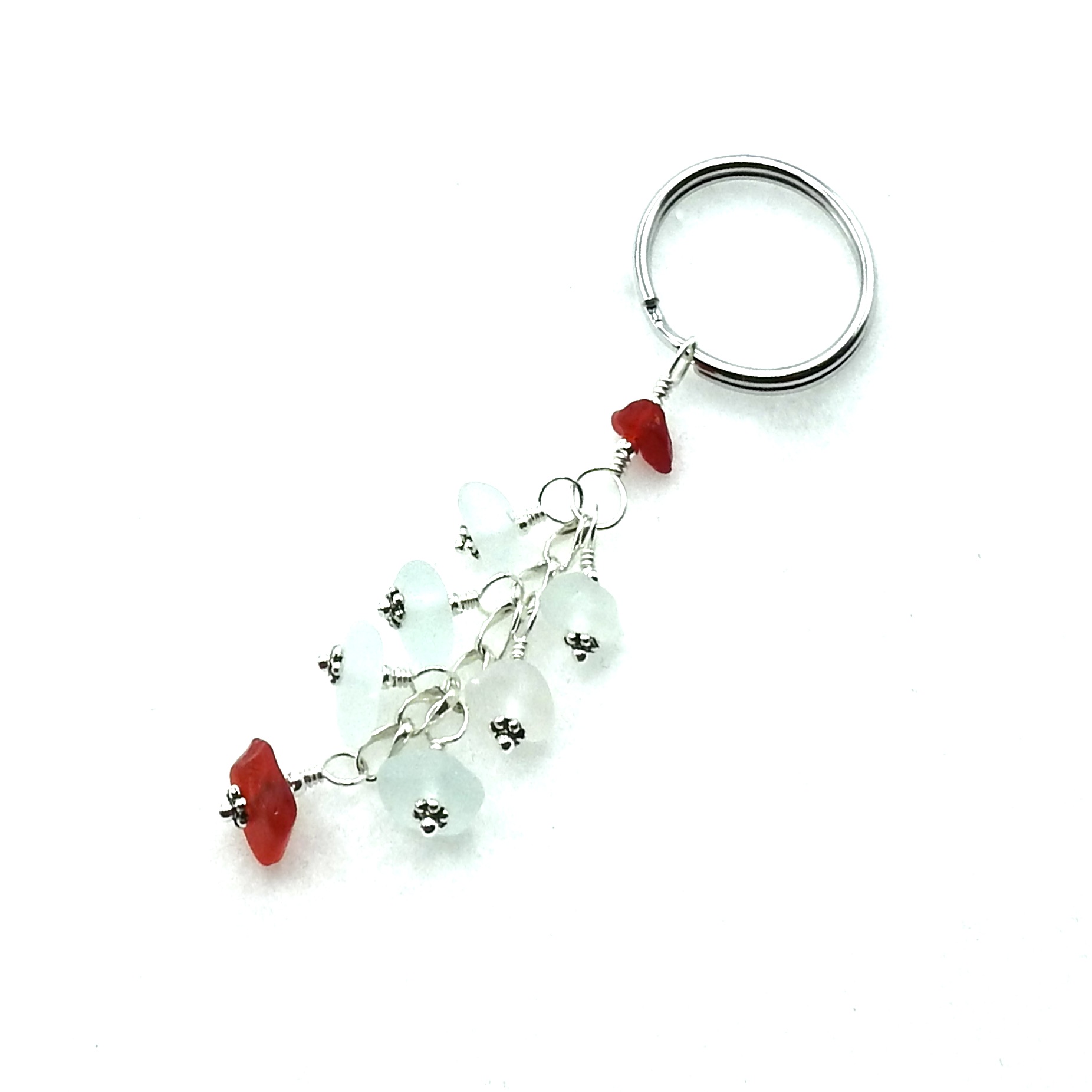 A dangly keychain, handmade with genuine sea glass pieces in shades of white with deep red accents.