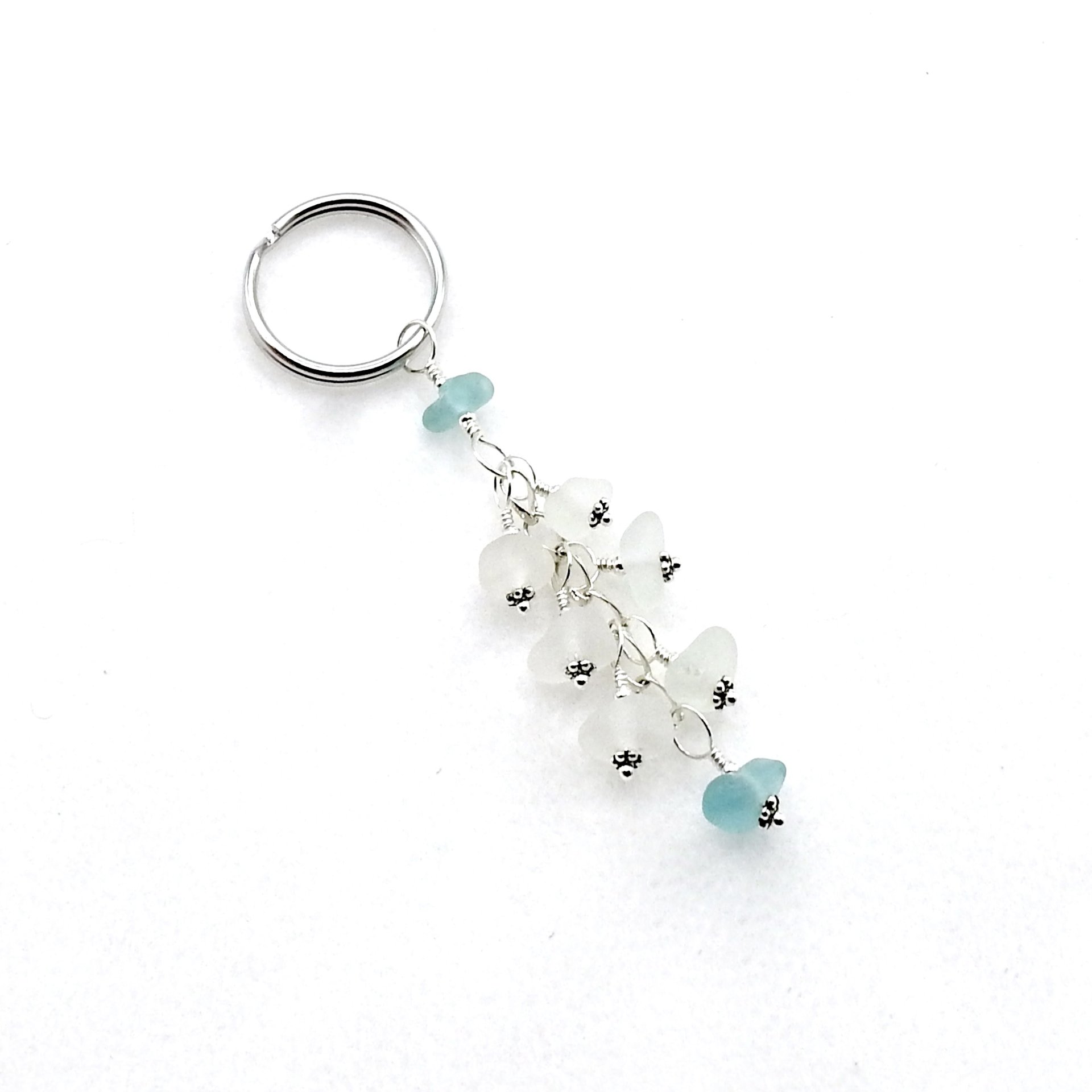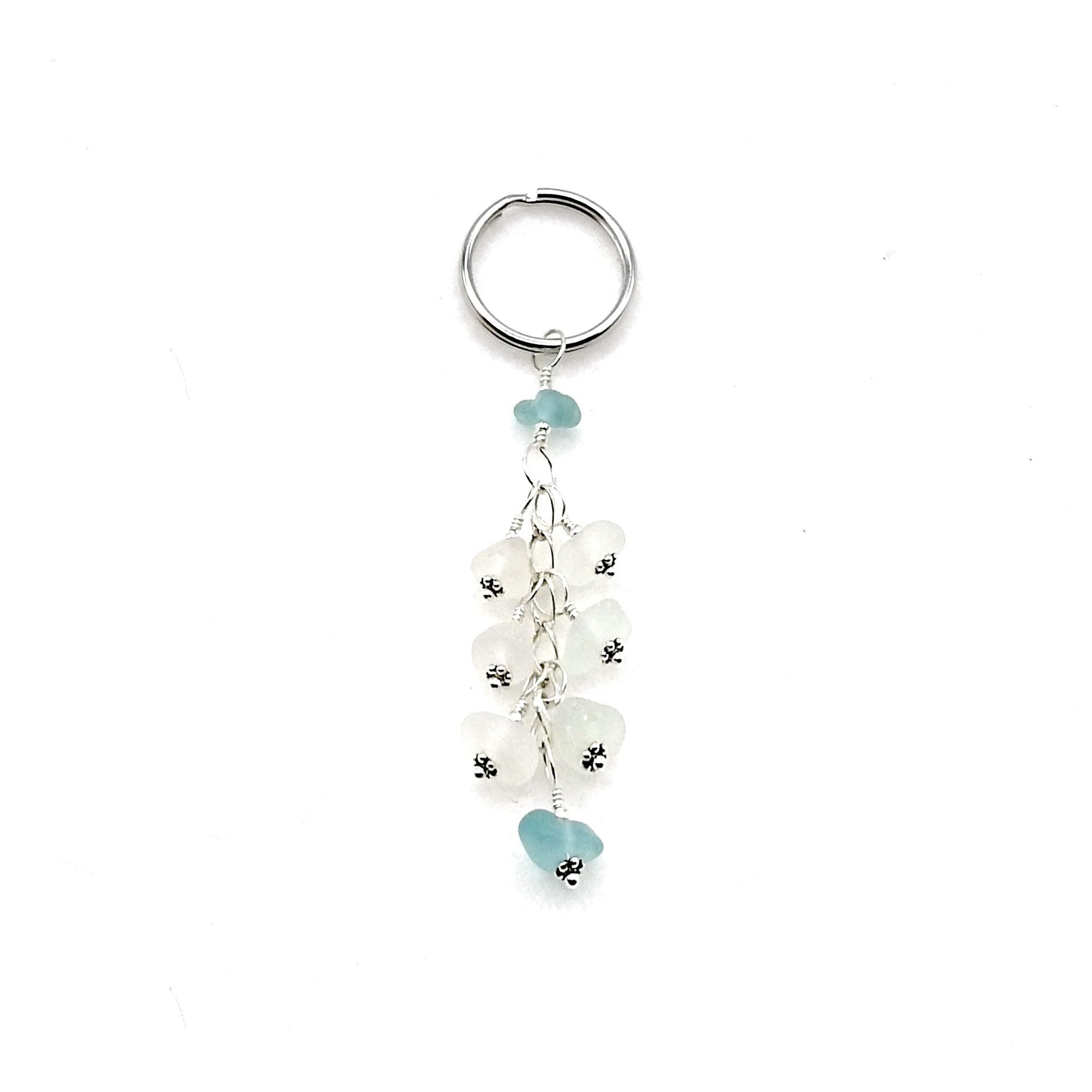 A dangly keyring, handmade with genuine sea glass in shades of white with soft pastel aqua blue accents.