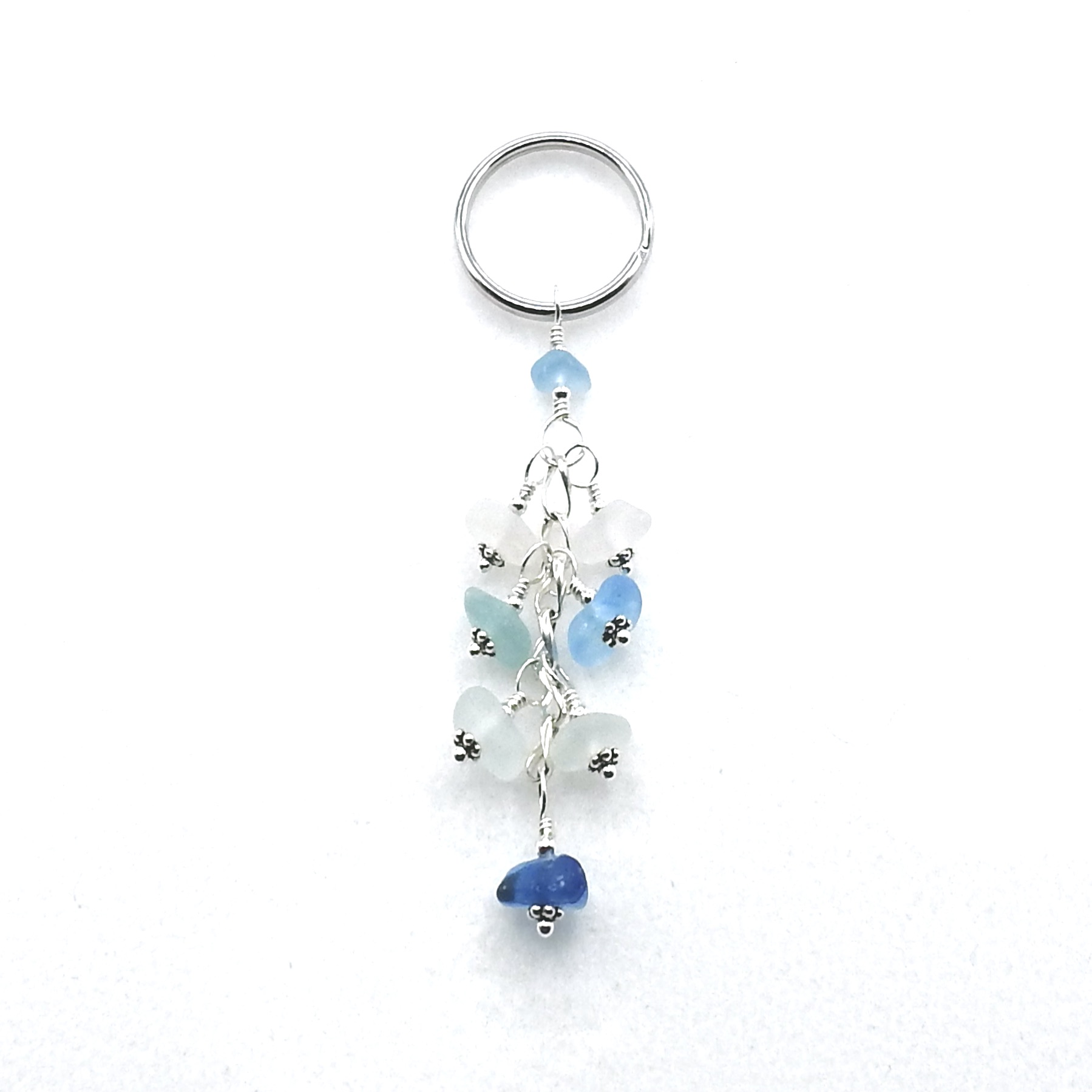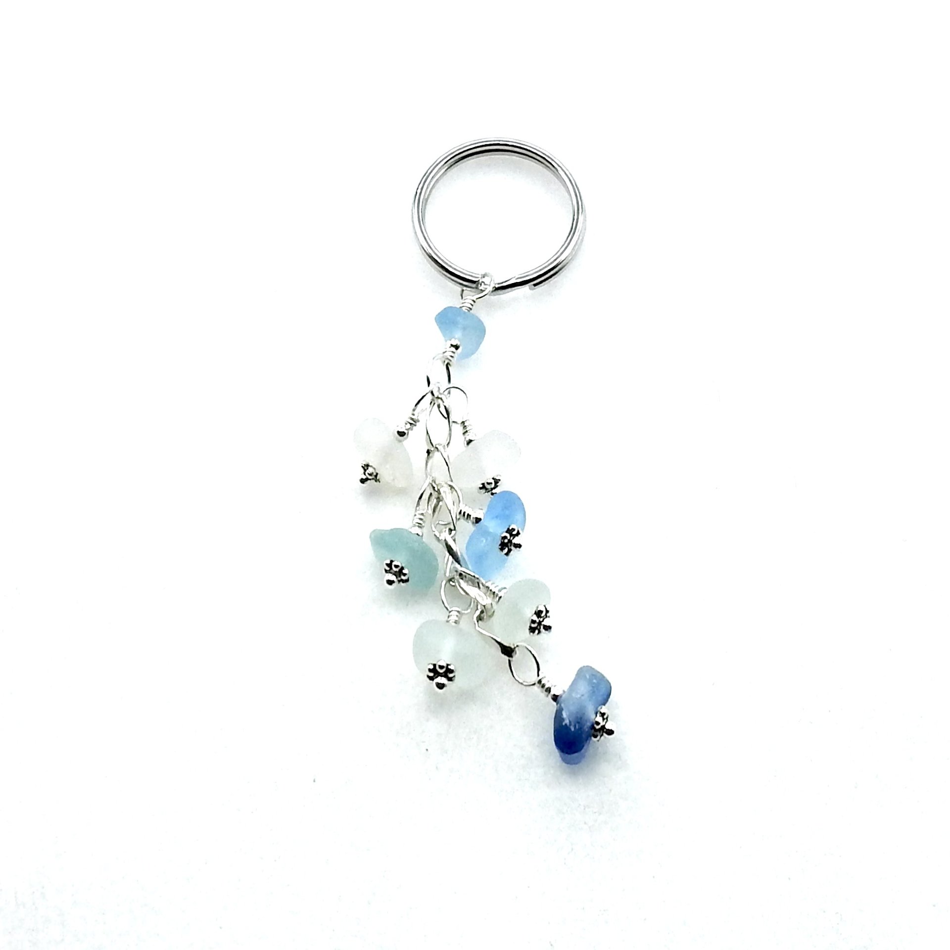 A dangly keychain, handmade with authentic sea glass pieces in shades of white and blue.