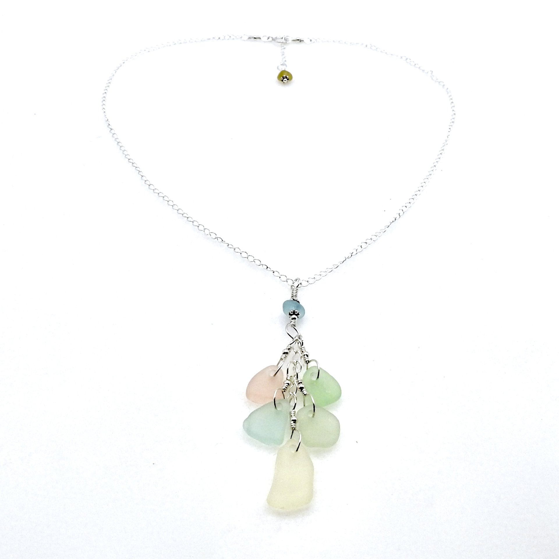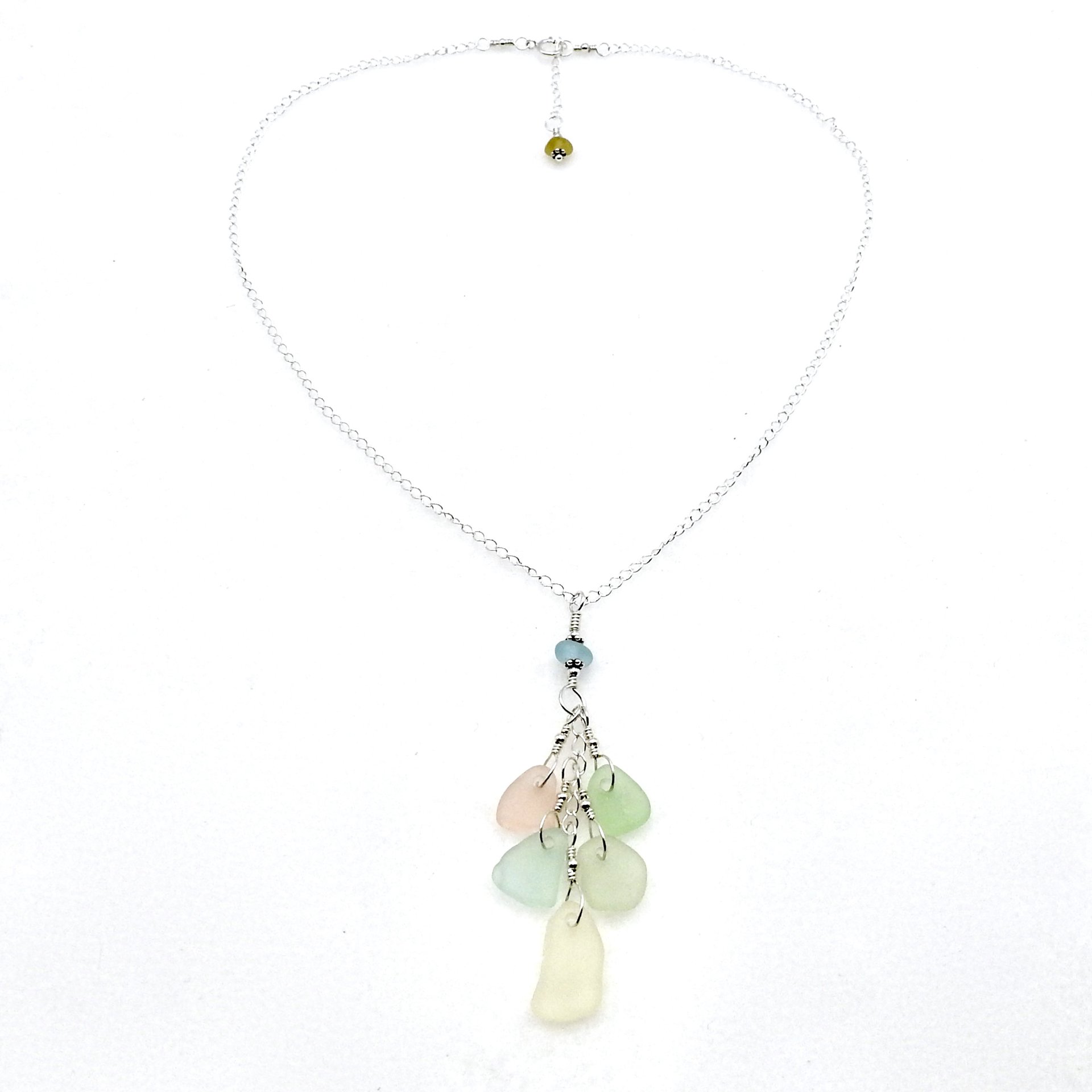 A short multi charm one of a kind necklace with an adjustable chain, handmade with genuine sea glass in soft pastel colours.