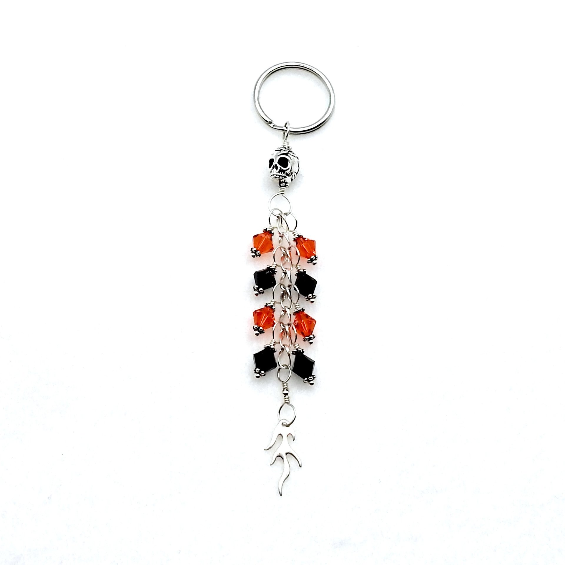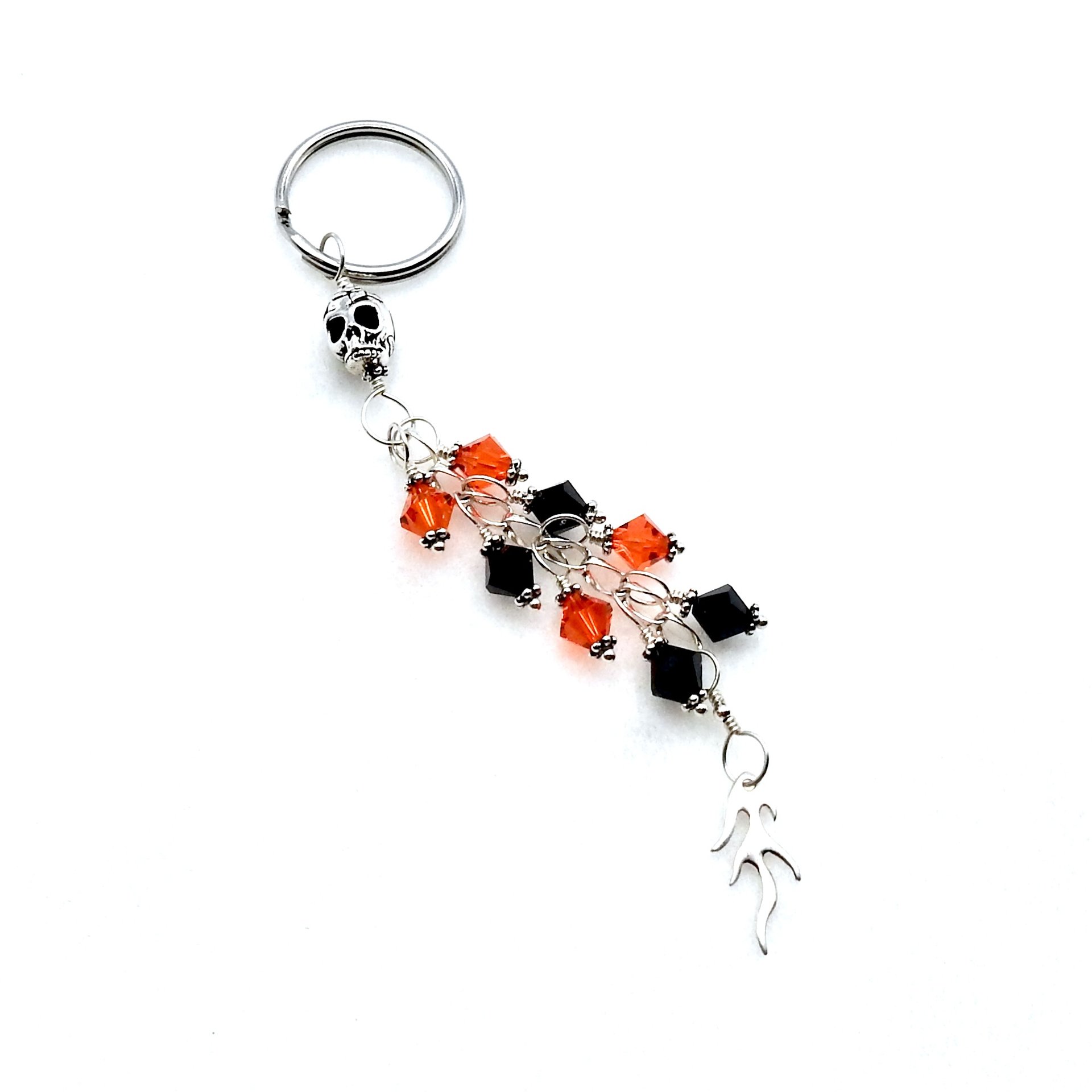 A skull dangle keychain, handmade with Swarovski Elements black and orange crystal beads and a sterling silver flame charm accent.