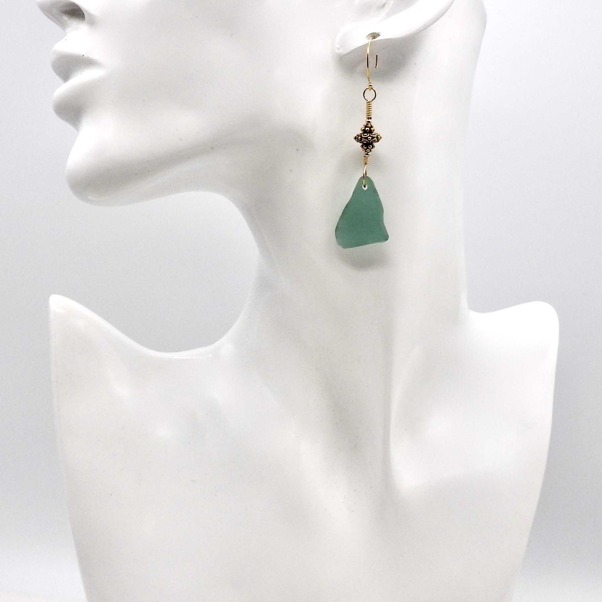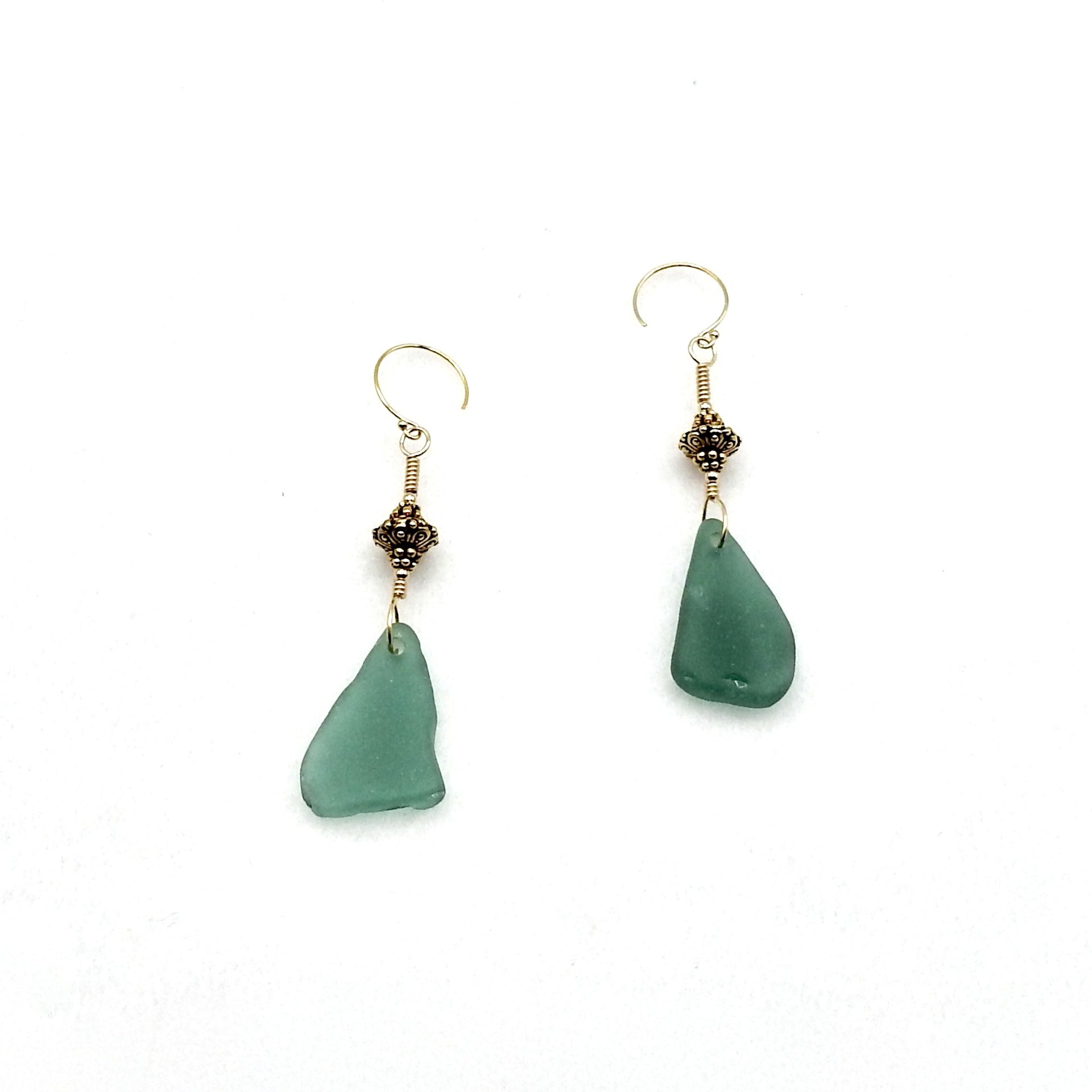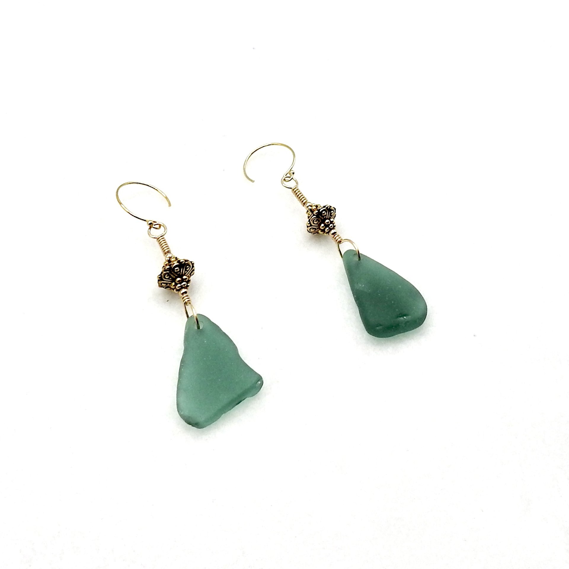 - materials - genuine sea glass, just under 1" (25.4mm) in length, 14K/20 gold filled wire, round beads and ear wires, lead free gold plated pewter beads